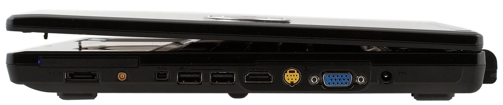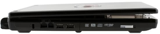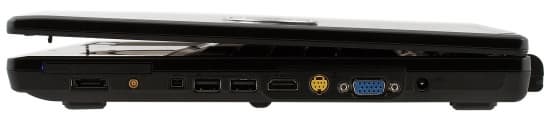 На правой стороне расположен штекер питания (он не до конца входит в гнездо, и все время кажется, что сидит неплотно), выход на внешний монитор, выход S-video, выход HDMI, еще два порта USB, 4-штырьковый порт IEEE1394, разъем ExpressCard, а под ним — порт eSATA и порт для подключения антенны для ТВ-тюнера.