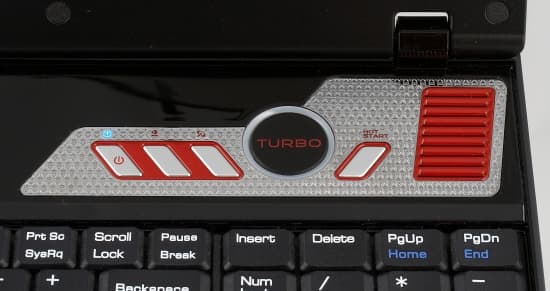 Самая левая — клавиша включения питания, она не выделена по размеру и отличается от других только маркировкой, следующая активирует/деактивирует веб-камеру, далее клавиша управления беспроводными интерфейсами (она циклически переключает комбинации Wi-Fi, Bluetooth, Wi-Fi + Bluetooth, все выключено). Далее идет кнопка Turbo. В режиме работы от сети она позволяет «в одно касание» увеличить частоту процессора и системной шины. В режиме работы от батарей эта же кнопка, по словам представителя компании на презентации, должна переводить систему в энергосберегающий ражим, однако на практике этого не происходило.