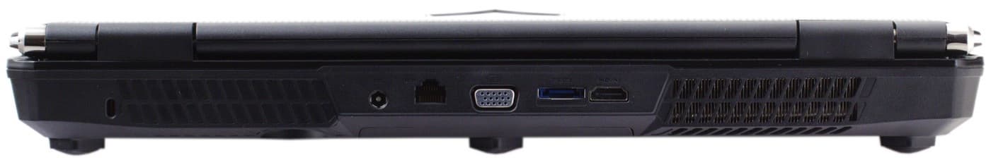 На задней панели находится выхлопная решетка вентиляции, с другой стороны — декоративный элемент под выхлоп второй системы охлаждения (собственно, это и напоминает игровой ноутбук ASUS). Посередине расположена площадка, на которой находится разъем питания, разъем проводной сети, порты eSATA (здесь он не скомбинирован с USB) и HDMI. В левом углу — порт для замка Кенсингтона.