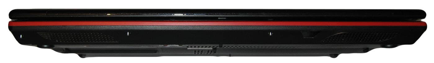 Корпус ноутбука практически не имеет острых граней, все углы и переходы немного скруглены. Крышка держится на двух небольших петлях, выступающих из корпуса вверх по углам, конструкция петель похожа на таковую в GX660. Хотя решение выглядит несколько старомодным, но особых минусов у него нет, тем более для настольной модели. Зато оно позволило сохранить заднюю панель открытой. На ней размещена выхлопная решетка (поэтому отвод воздуха лучше, да и шум пониже) и некоторые разъемы, в которые подключаются толстые провода. Плюс к этому, экран можно откинуть на любой угол до 180 градусов. Звук от петель при открытии немного напоминает классический звук хождения по хрустящему свежему снегу.