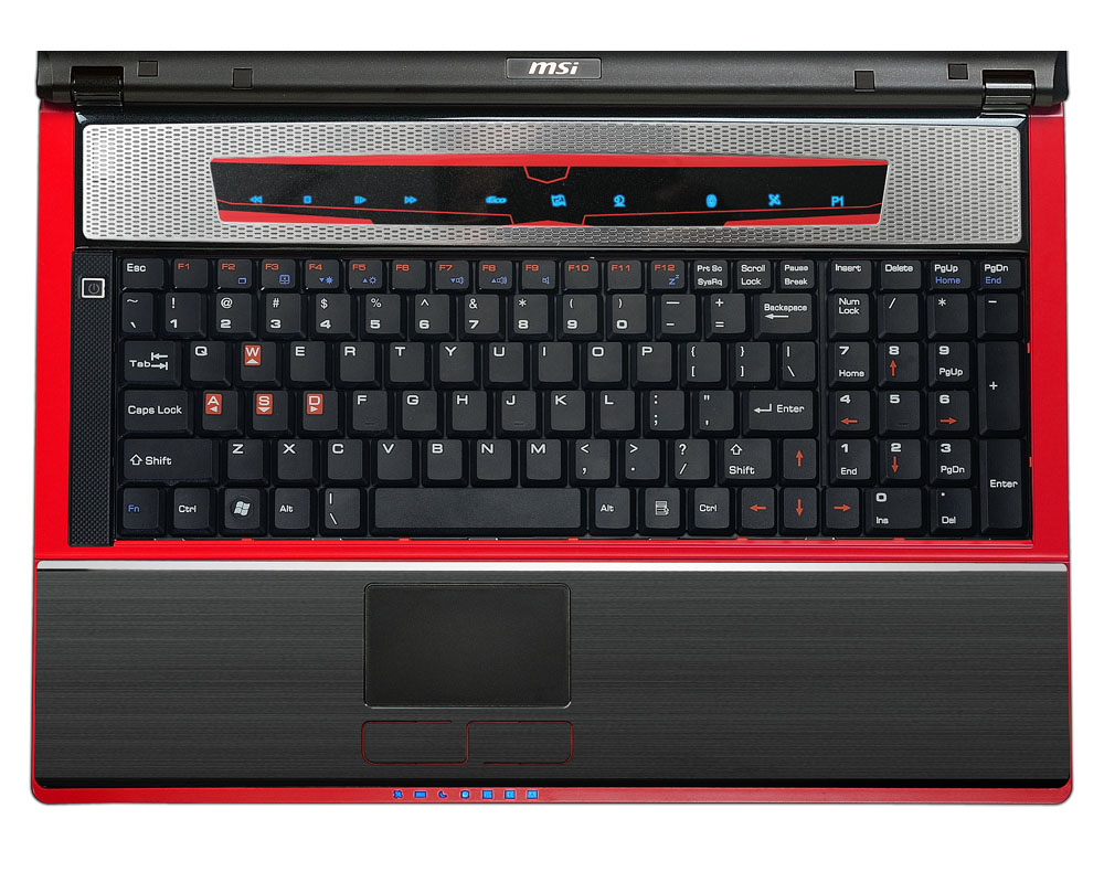 В закрытом состоянии владельцу остается лишь восхищаться верхней экранной крышкой из шлифованного алюминия с утопленной надписью «msi» под хром да умеренной толщиной корпуса, визуально разбиваемой красной вставкой по периметру. Обильные отпечатки на такой поверхности хорошо видны под любым углом и плохо убираются.