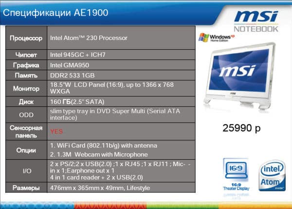Как видите, модель построена на платформе Atom и имеет достаточно скромные, по текущим меркам, характеристики. В то же время, несмотря на наличие сенсорного экрана, модель имеет более чем демократичную рекомендованную цену.