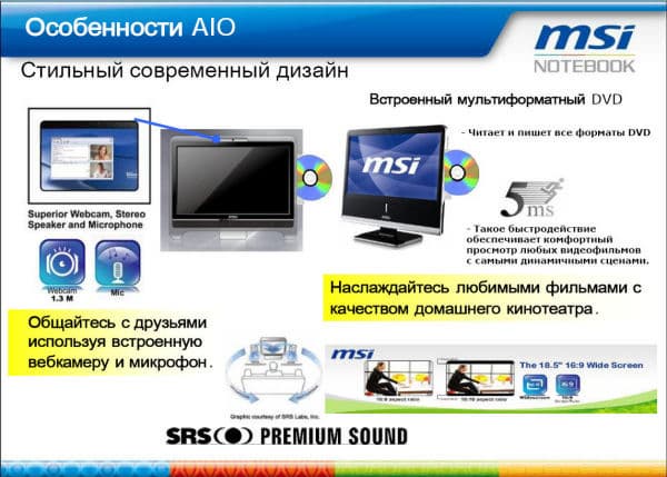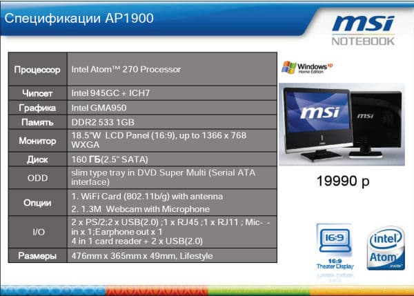 Помимо ноутбуков X-Slim, MSI представила достаточно большую линейку новых для себя устройств, Display или LCD-PC. Эти устройства представляют собой моноблок: весь компьютер собран в корпусе монитора. В принципе, сама по себе идея не нова, время от времени разные производители пытались вывести такие продукты на рынок, однако устойчивого спроса на них не наблюдалось.