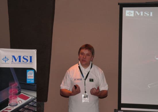 Ведущий специально упомянул, что компания MSI была создана инженерами, и инженерные новинки и доработки — ее конек. И в каждом своем продукте компания старается сделать что-то особенное, что выделяло бы его на рынке. Например, в одной из последних видеокарт MSI реализована технология «разгона одной кнопкой» — при нажатии кнопки видеокарта мгновенно разгоняется.