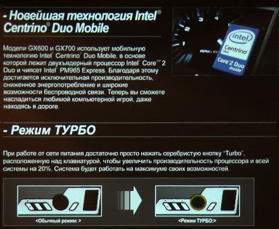 Разгон связан с увеличением энергопотребления и тепловыделения ноутбука, поэтому он осуществляется только тогда, когда ноутбук работает от сети. Если GX600 работает от батарей, то при нажатии кнопки Turbo он, наоборот, переходит в энергосберегающий режим. В этом режиме он может проработать примерно на 25% дольше (по данным компании).