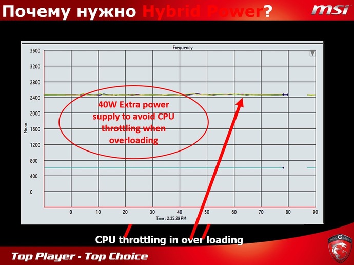 В новых ноутбуках MSI представлена технология Hybrid Power. Суть ее вот в чем. Иногда при высокой нагрузке питание процессора проседает, вынуждая его уходить в троттлинг.