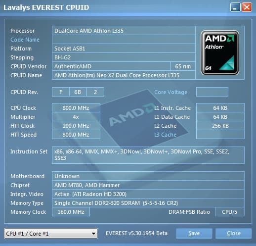 | Процессор | Athlon Neo X2 L335 (1,6 ГГц, кэш второго уровня 512 МБ, шина HT 800 МГц) | |