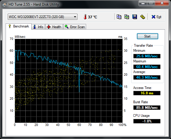 | Жесткий диск | WDC WD3200BEVT-22ZCT0 (320 ГБ, 5400 об./мин, SATA) | |