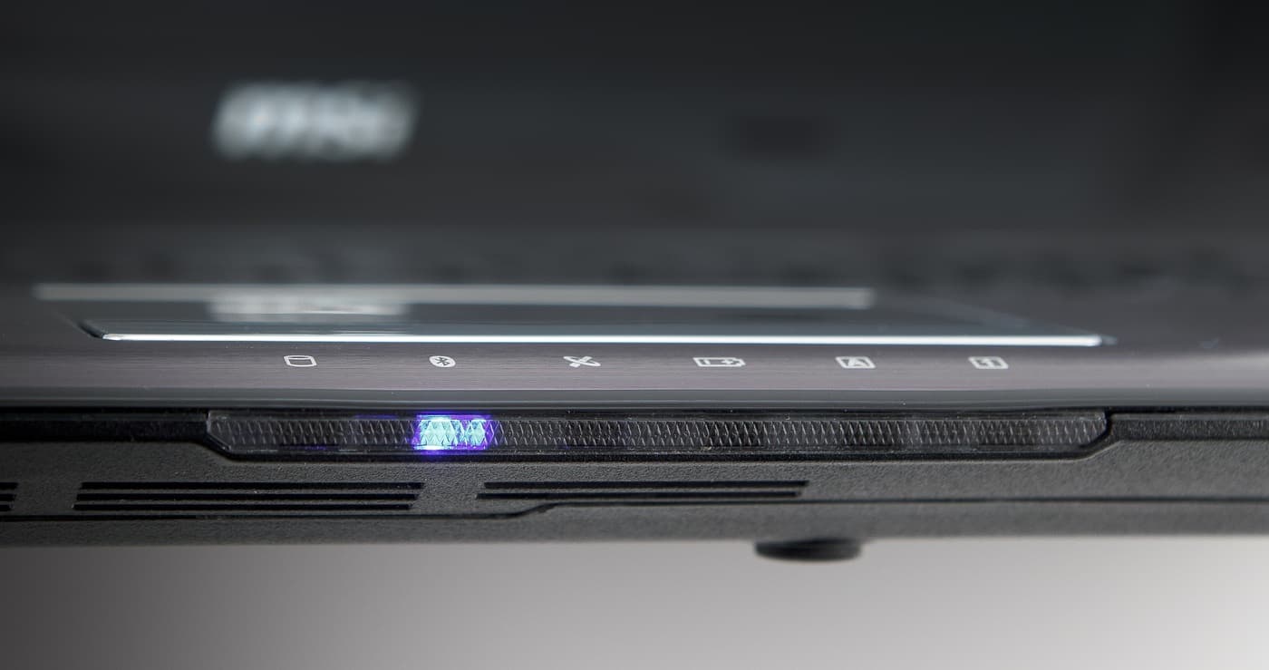Начнем с индикаторов. Они расположены перед тачпадом, поэтому не перекрываются при печати. Индикаторы собраны под единую прозрачную пластину, смотрящую вперед.