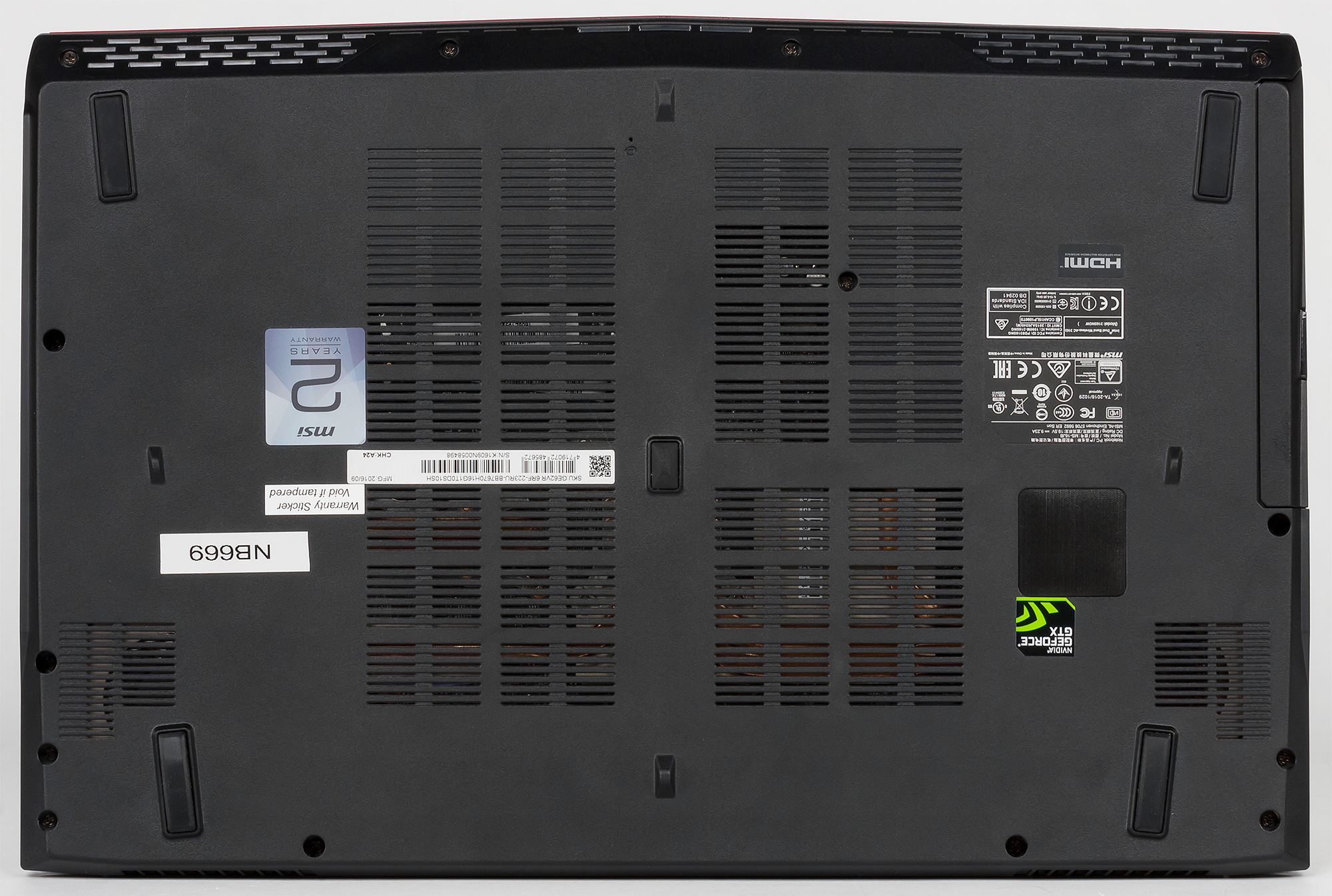 Рабочая поверхность, обрамляющая клавиатуру и тачпад, сделана из металла черного цвета. Нижняя панель ноутбука и боковые грани выполнены из классического черного матового пластика. Нижняя панель корпуса имеет воздухозаборники, закрытые красной сеткой, а на заднем торце корпуса расположены вентиляционные отверстия для выдува горячего воздуха. Кроме того, на нижней панели расположена сетка, закрывающая встроенный сабвуфер.