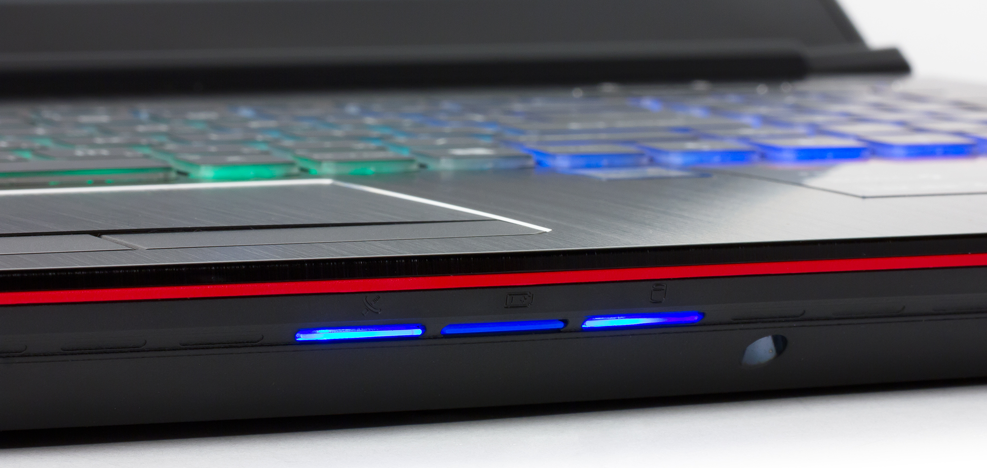 Светодиодные индикаторы состояния в этом ноутбуке вынесены на переднюю грань корпуса. Всего таких индикаторов три: состояния беспроводной сети, состояния аккумулятора, активности подсистемы хранения данных.