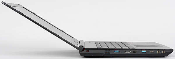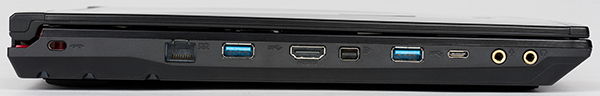 На левом торце корпуса ноутбука расположены два порта USB 3.0, порт USB 3.1 (Type-C), видеовыходы HDMI 1.4 и Mini-DP 1.2, два аудиоразъема типа миниджек, разъем RJ-45 и отверстие для кенсингтонского замка.