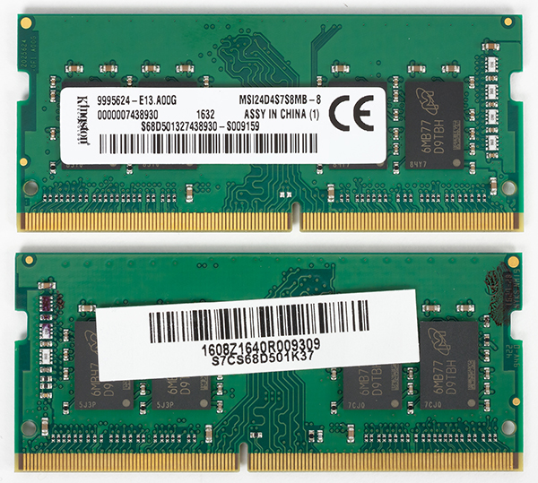 В нашем случае в ноутбуке было установлено два модуля памяти DDR4-2400 емкостью по 8 ГБ (Kingston MSI24D4S7S8MB-8), и, естественно, память работала в двухканальном режиме. Отметим, что может устанавливаться и больший объем памяти (32 ГБ).