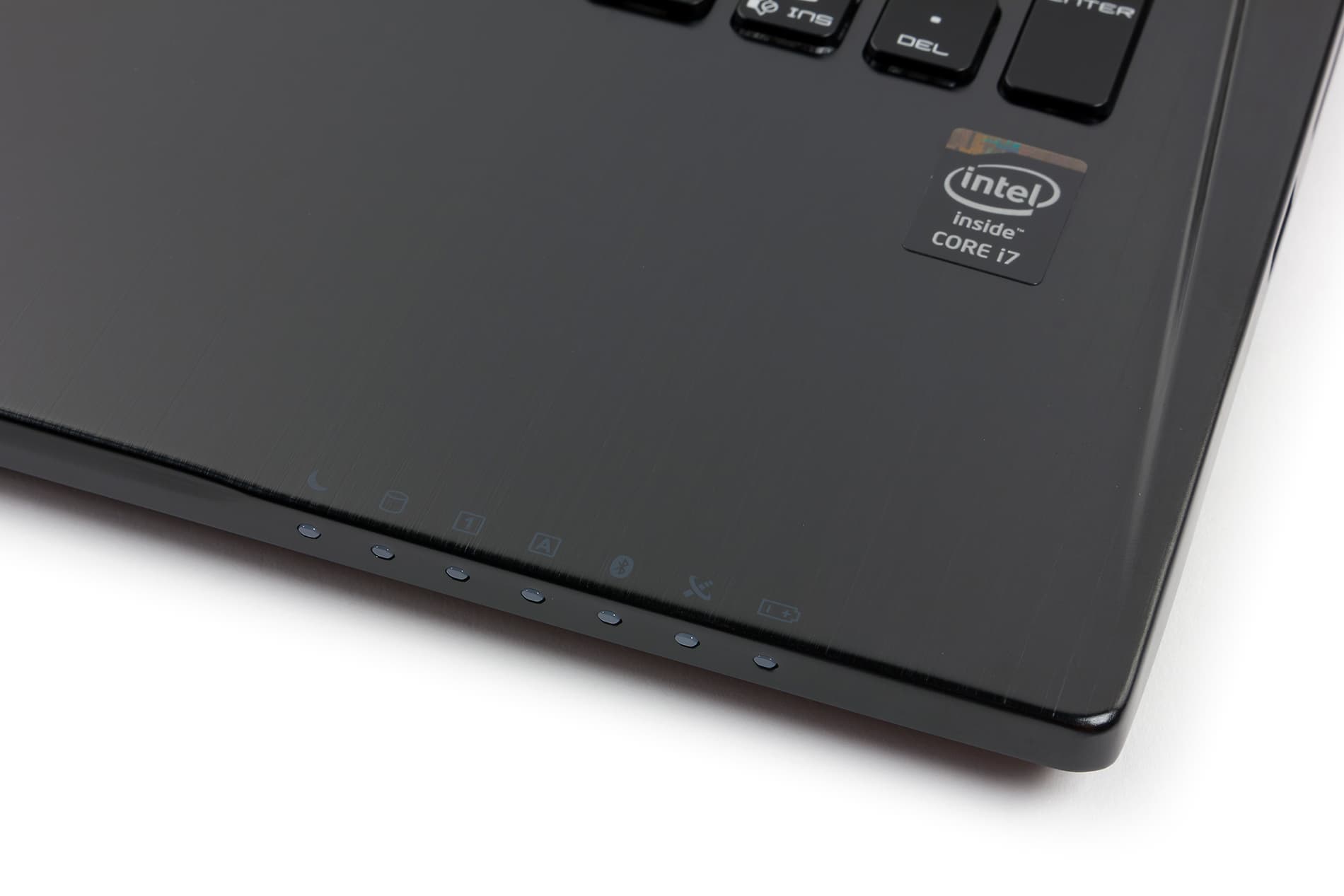 Светодиодные индикаторы состояния ноутбука расположены справа на передней грани корпуса. Всего таких индикаторов семь.