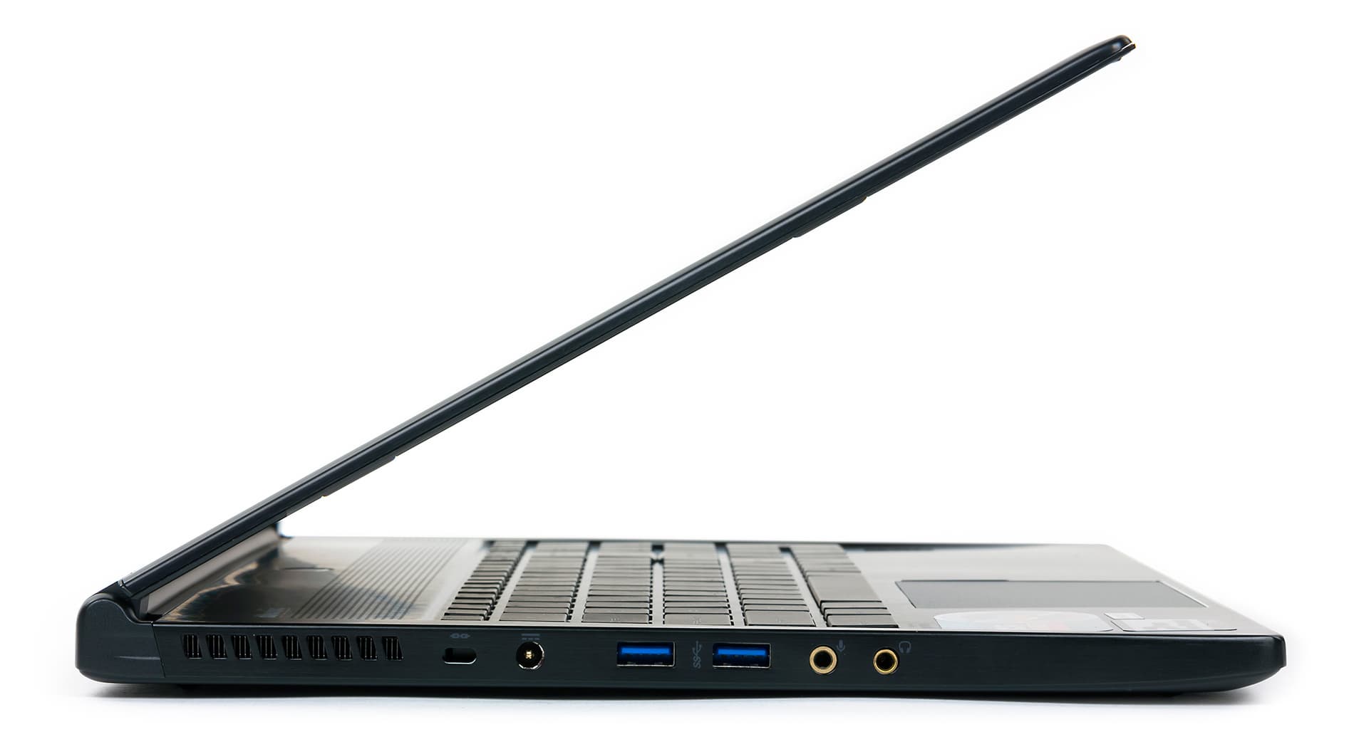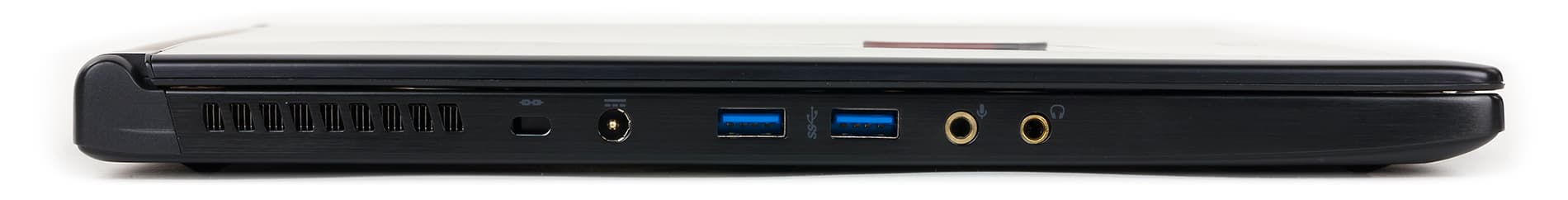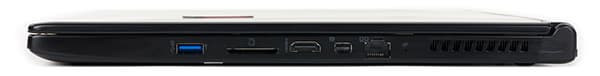 На левом торце корпуса расположены два порта USB 3.0, два аудиоразъема типа миниджек, разъем питания и отверстие для кенсингтонского замка.
