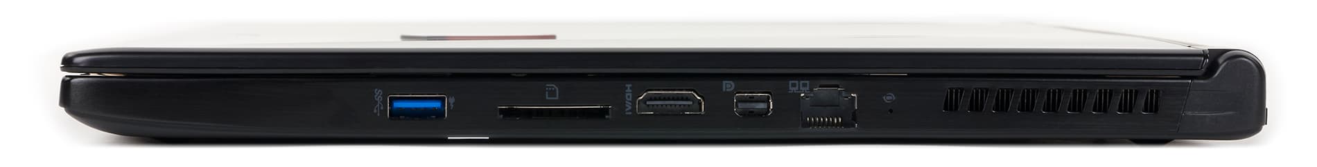 На правом торце корпуса имеется еще один порт USB 3.0 (с поддержкой функции зарядки мобильных гаджетов в выключенном состоянии ноутбука), сетевой разъем RJ-45, разъемы HDMI и Mini-DisplayPort, а также слот для SD-карт памяти. Отметим, что разъем HDMI позволяет подключать мониторы с разрешением 4К. Кроме того, ноутбук MSI GS60 2PE Ghost Pro поддерживает технологию Matrix Display по схеме 2+1, то есть позволяет подключать еще два внешних монитора.