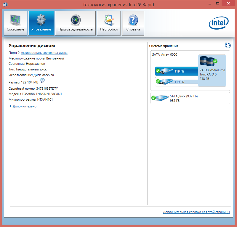 | Накопитель | 2×SSD Toshiba THNSNH128G8NT (RAID 0, суммарный объем 256 ГБ) 1×HDD HGST HTS721010A9E630 (1 ТБ, 7200 об/мин, SATA-III) | |