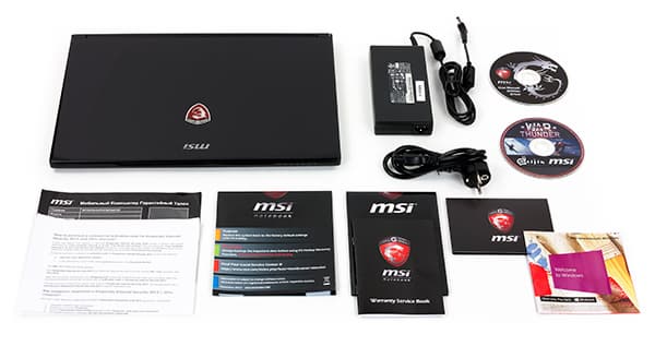 Кроме самого ноутбука в комплект поставки традиционно входит краткое руководство пользователя, DVD-диск с драйверами и утилитами, бонусный DVD-диск с игрой War Thunder (правда, в ноутбуке нет оптического привода), чехол-папка для ноутбука и, конечно же, адаптер питания на 150 Вт (19,5 В; 7,7 А). Отметим, что адаптер питания в данном случае точно такой же, как и для модели MSI GS70 2PE Stealth Pro.