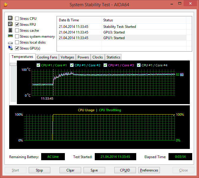 В режиме одновременной загрузки и ядер процессора (Stress FPU), и графического ядра (Stress GPU) ядра процессора работают на частоте 2,4 ГГц, а их температура составляет 82 °С.