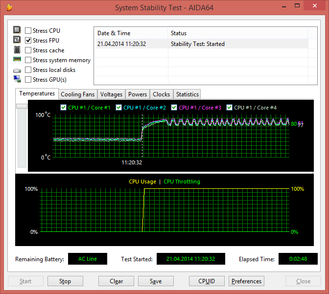 При загрузке процессора тестом Stress CPU (утилитой AIDA64 Extreme Edition — тест на стабильность системы), который использует целочисленные вычисления, частота процессора составляет 3,2 ГГц (напомним, что для процессора Intel Core i7-4700HQ максимальная частота в режиме Intel Turbo Boost составляет 3,4 ГГц). Температура процессора в этом режиме загрузки увеличивается до 75 °С.