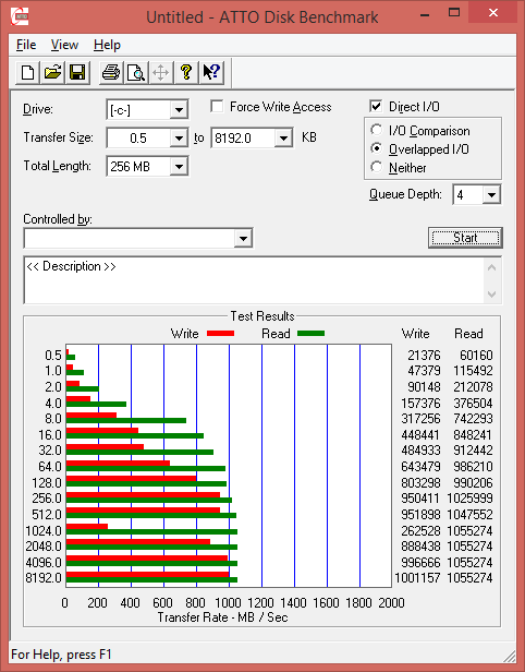 Для RAID-массива утилита ATTO Disk Benchmark определяет максимальную скорость последовательного чтения чуть выше 1,0 ГБ/с, а скорость последовательной записи — чуть менее 1,0 ГБ.