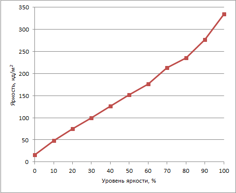 Зависимость изменения яркости экрана на белом фоне от установленного (в процентах) уровня яркости представлена на графике: