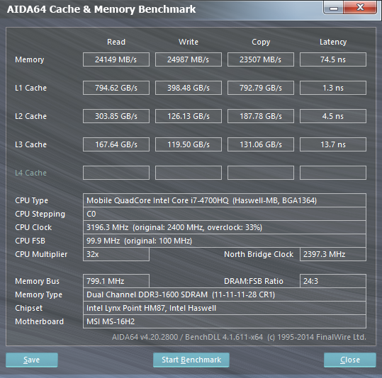 Согласно данным утилиты AIDA64 Cache & Memory Benchmark, скорость записи данных в память составляет 24987 МБ/с, а скорость чтения — 24149 МБ/с. Для памяти DDR3-1600 (пиковая пропускная способность 12800 МБ/с) в двухканальном режиме работы это вполне типичные показатели.