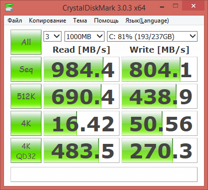 Утилита CrystalDiskMark определяет скорость последовательного чтения на уровне 984 МБ/с, а скорость последовательной записи — на уровне 804 МБ/с.