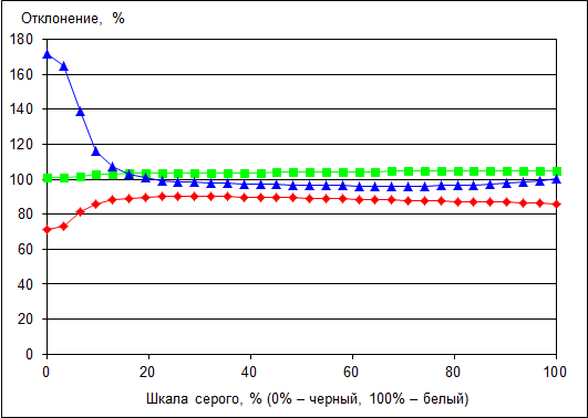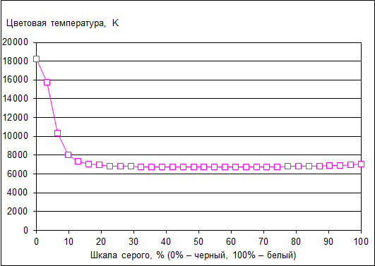 Стабильность цветовой температуры объясняется стабильностью основных цветов по все шкале серого.