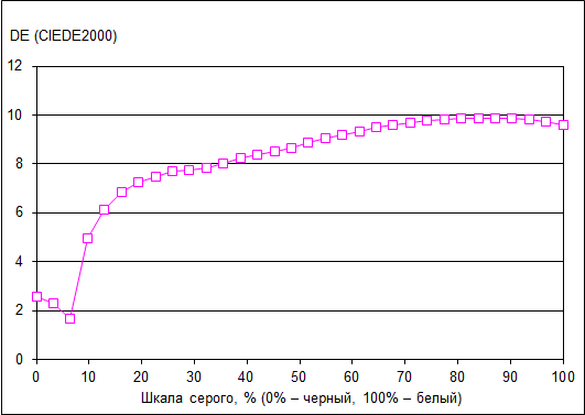 Что касается точности цветопередачи (дельта Е), то ее значение не превосходит 10, что является допустимым результатом для данного класса экранов.