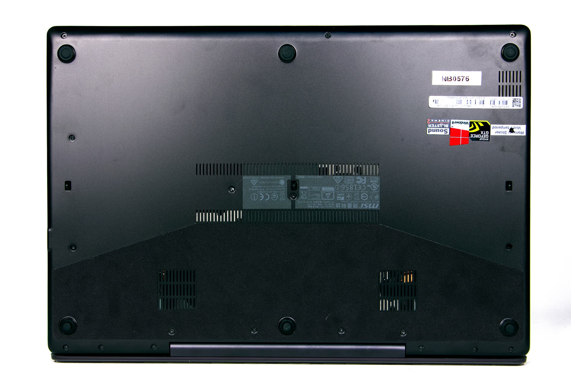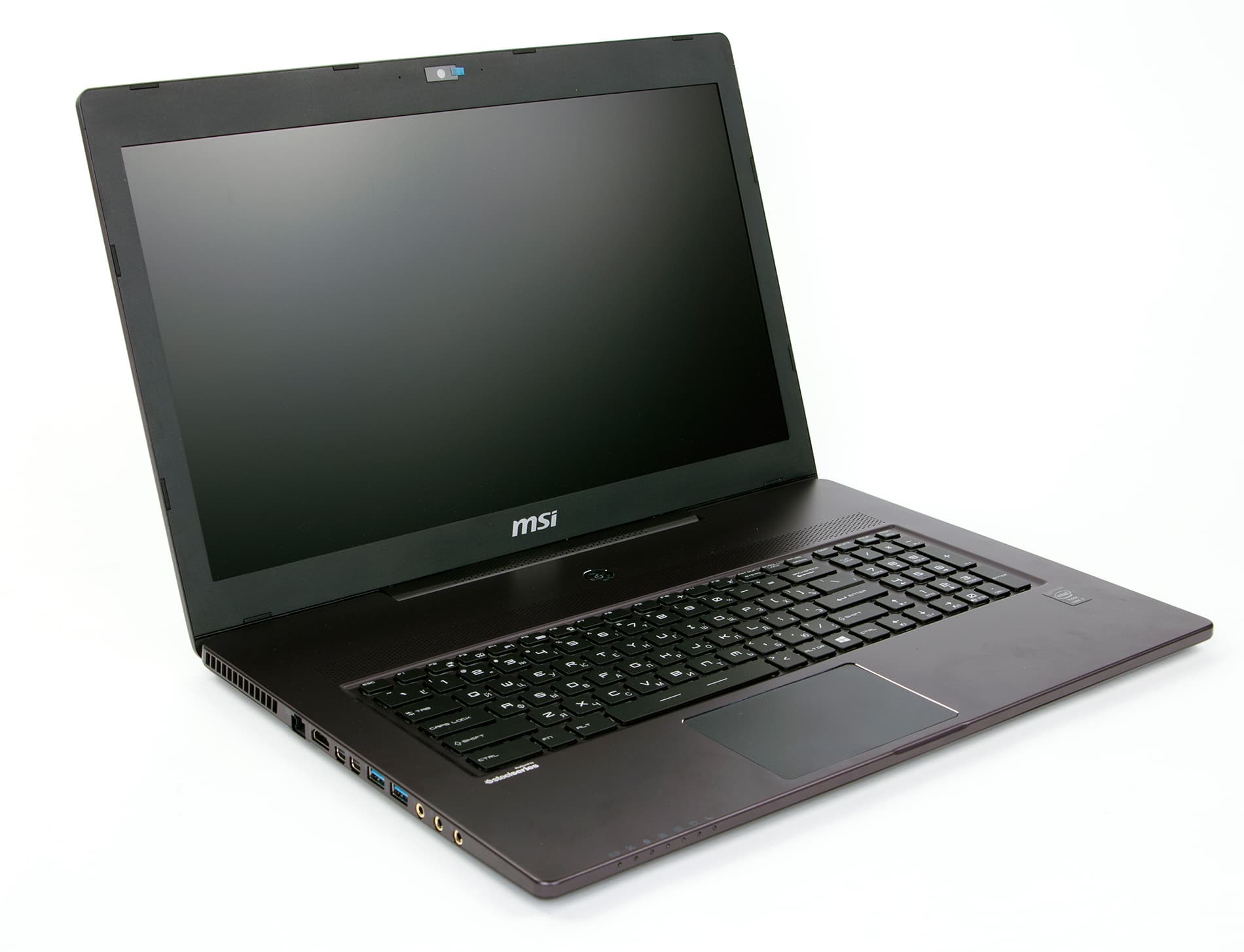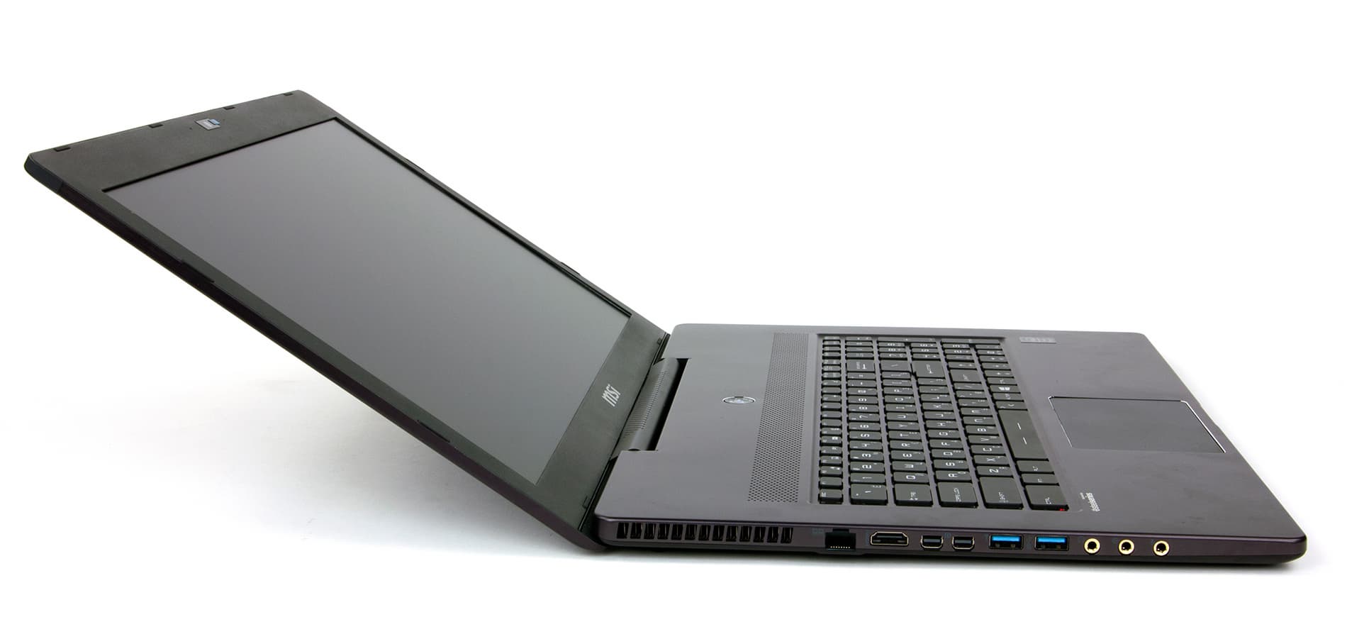 Собственно, из традиционного черного пластика здесь сделана только рамка экрана. Рамка эта не очень широкая: ее толщина с боков составляет 15 мм, сверху — 30 мм, а снизу — 25 мм. На рамке сверху по центру экрана расположена веб-камера и миниатюрные отверстия двух микрофонов, а снизу — опять-таки логотип MSI.