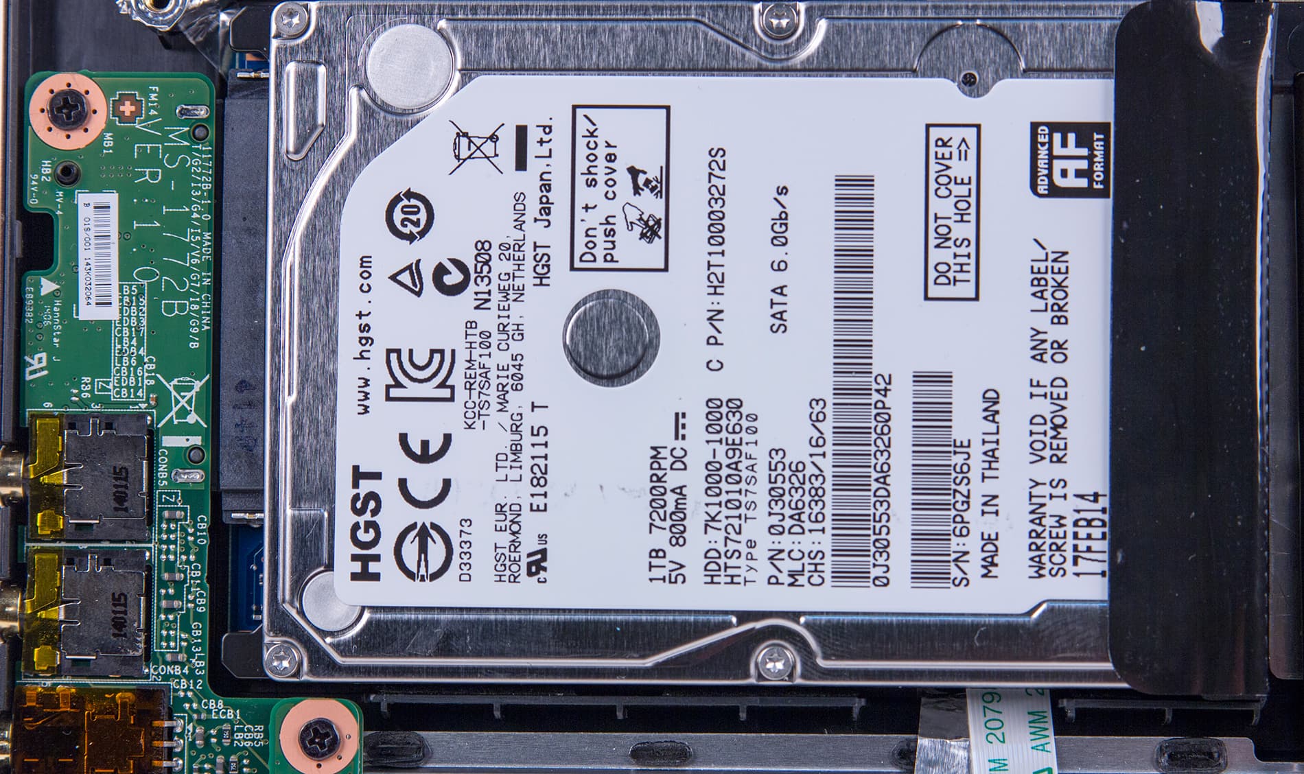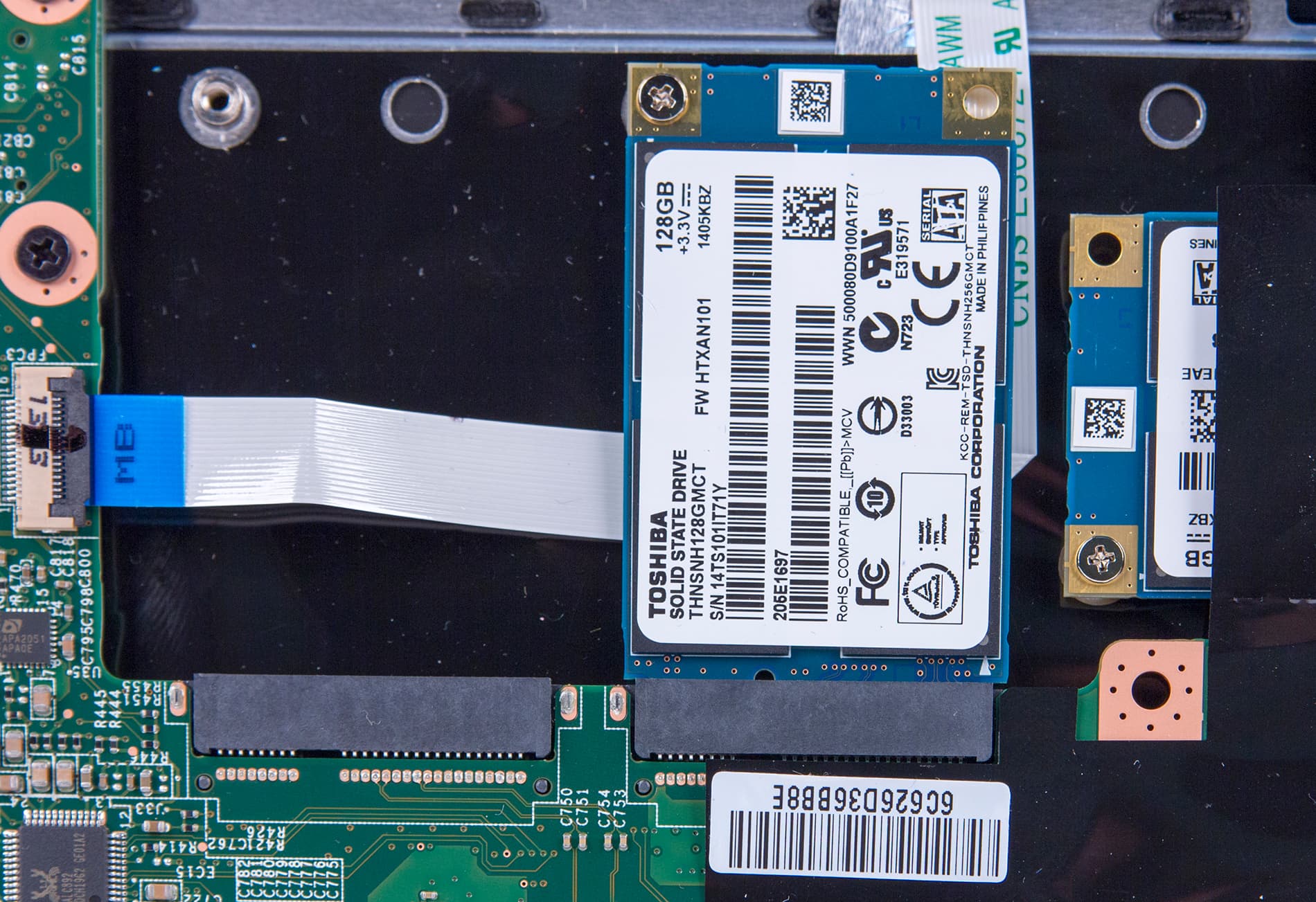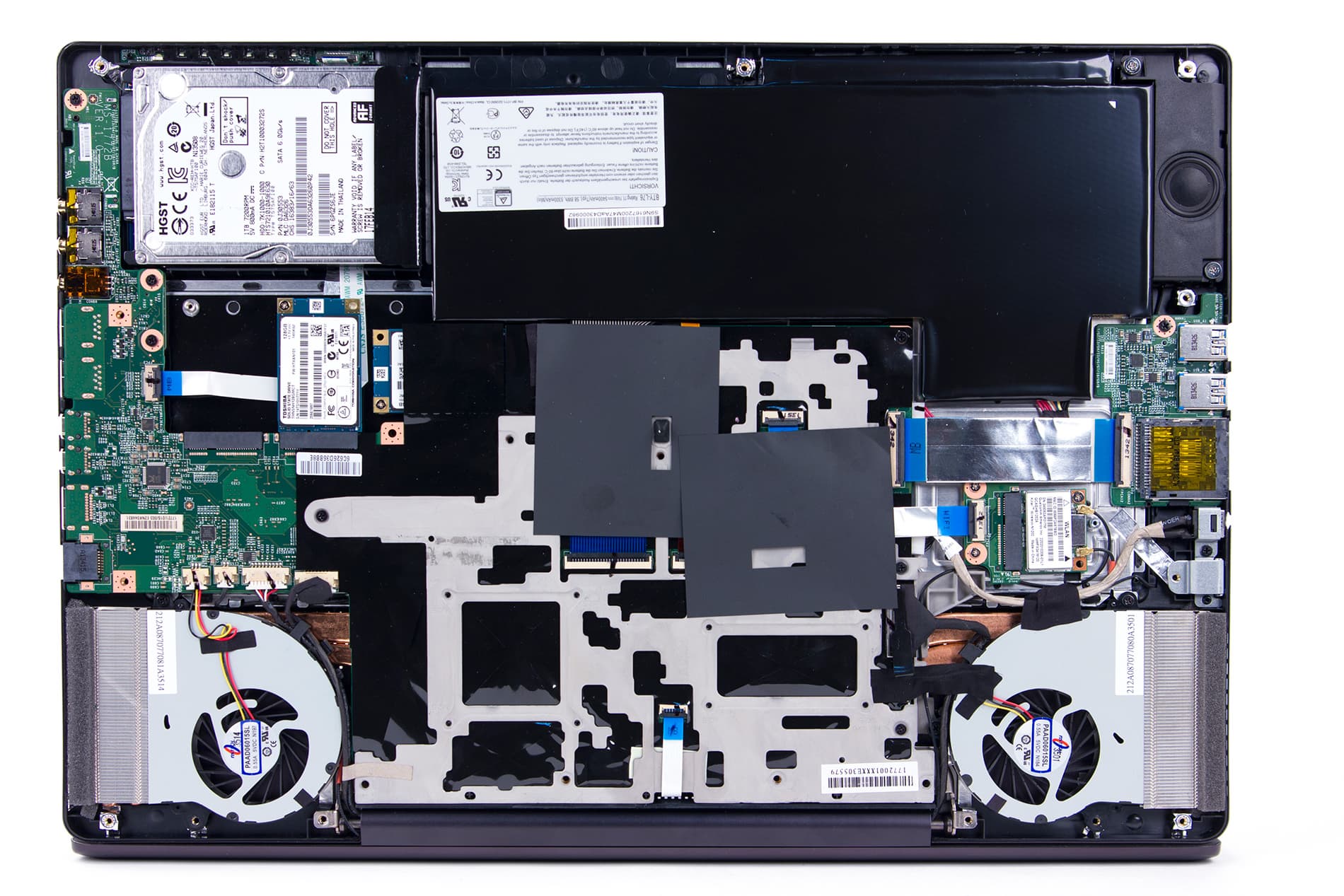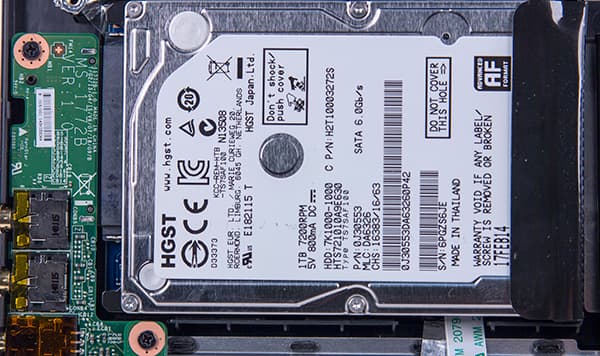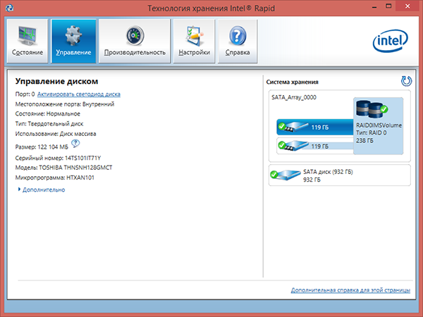 Подсистема хранения данных в этом ноутбуке очень производительная. Ее маркетинговое наименование — Super RAID. Она включает два SSD-накопителя Toshiba THNSNH128GMCT (mSATA) по 128 ГБ каждый, которые объединены в RAID-массив уровня 0 по технологии Intel RST. Кроме того, имеется и отдельный HDD-диск HGST HTS721010A9E630 емкостью 1 ТБ. Понятно, что на RAID-массив устанавливается операционная система и все приложения, а HDD-диск используется для хранения данных.