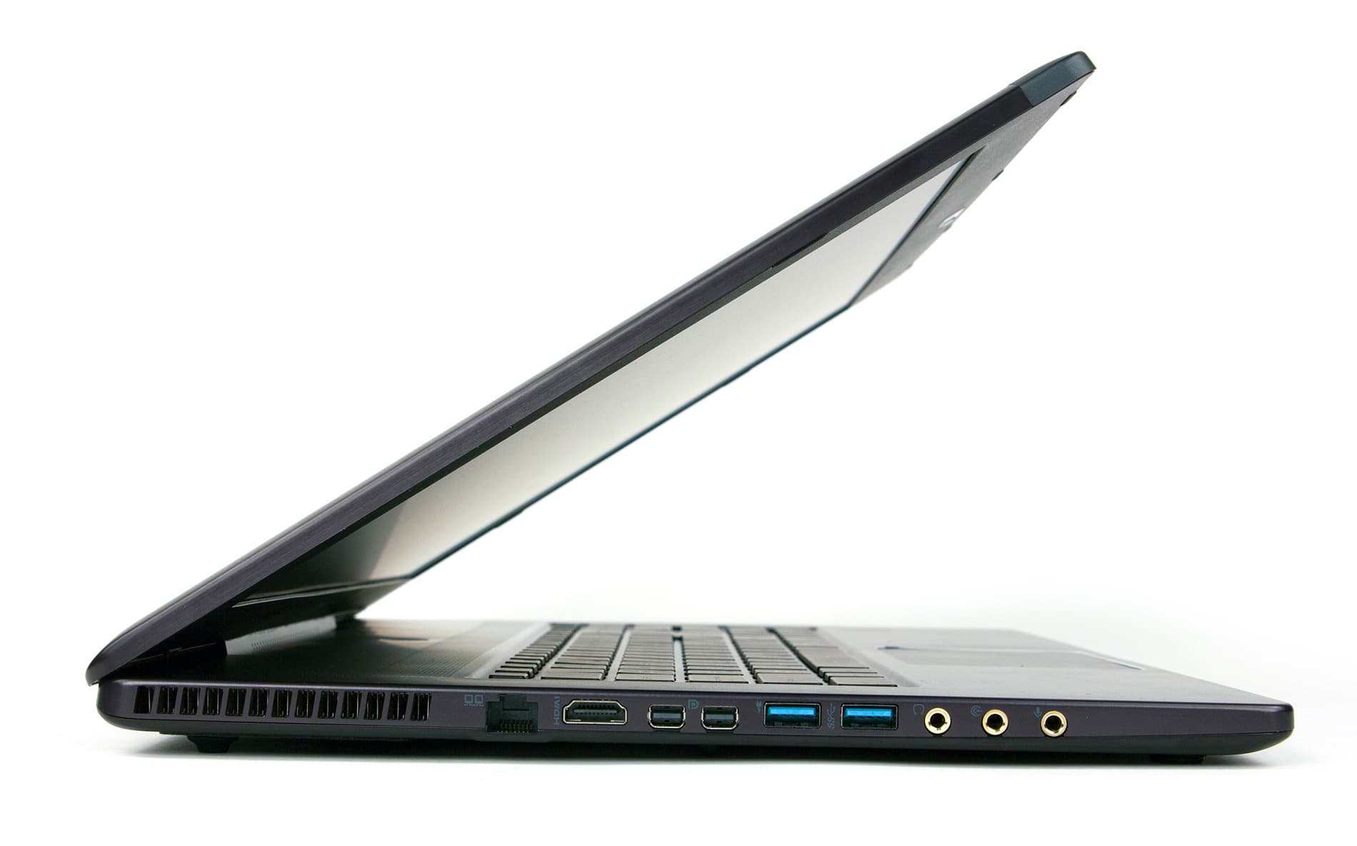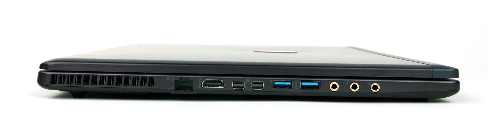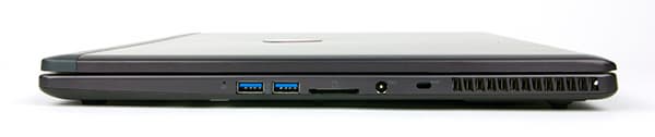 На левом торце корпуса расположены два порта USB 3.0, три аудиоразъема типа миниджек, сетевой разъем RJ-45, разъем HDMI и два разъема Mini-DisplayPort. Отметим, что разъем HDMI позволяет подключать мониторы с разрешением 4К. Кроме того, ноутбук MSI GS70 поддерживает технологию Matrix Display по схеме 2+1, то есть позволяет подключать еще два внешних монитора. На этом же торце расположена и решетка радиатора системы охлаждения.