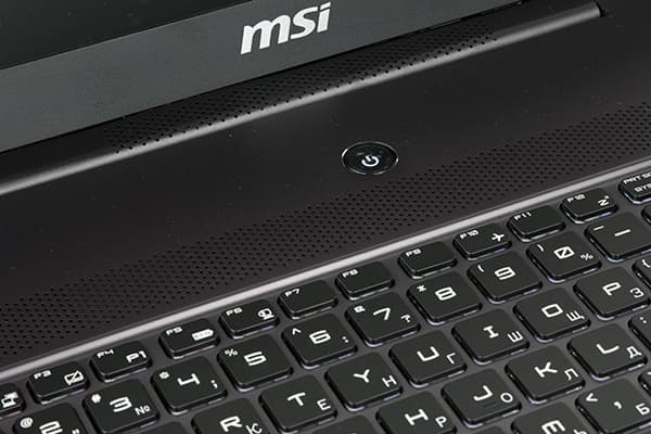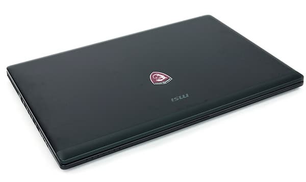 Корпус ноутбука одноцветный: целиком черный c немного серебристым отливом. И только на крышке ноутбука имеется подсвечиваемый логотип в форме щита с драконом (логотип игровой серии ноутбуков MSI). Этот логотип имеется у всех новых моделей 2014 года (ранее его не было), но у одних моделей он подсвечивается, а у других — нет.