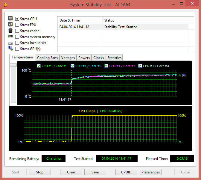 При загрузке процессора тестом Stress CPU (утилитой AIDA64 Extreme Edition — тест на стабильность системы), который использует целочисленные вычисления, частота процессора составляет 3,2 ГГц (напомним, что для процессора Intel Core i7-4700HQ максимальная частота в режиме Intel Turbo Boost составляет 3,4 ГГц). Температура процессора в этом режиме загрузки увеличивается до 83 °С.