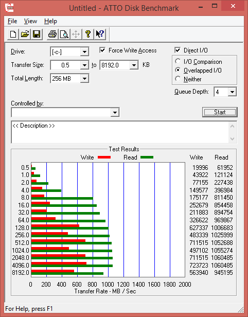 Утилита ATTO Disk Benchmark определяет максимальную скорость последовательного чтения на уровне 1,0 ГБ/с, а скорость последовательной записи — на уровне 700 МБ/с. Это, безусловно, очень хороший результат, но не удивительный для двух SSD-накопителей, объединенных в RAID-массив уровня 0.