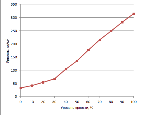 Зависимость изменения яркости экрана на белом фоне от установленного (в процентах) уровня яркости представлена на графике:
