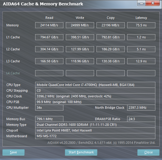 Согласно данным утилиты AIDA64 Cache & Memory Benchmark, скорость записи данных в память составляет 24999 МБ/с, а скорость чтения — 24114 МБ/с. Для памяти DDR3-1600 (пиковая пропускная способность 12800 МБ/с) в двухканальном режиме работы это вполне типичные показатели.