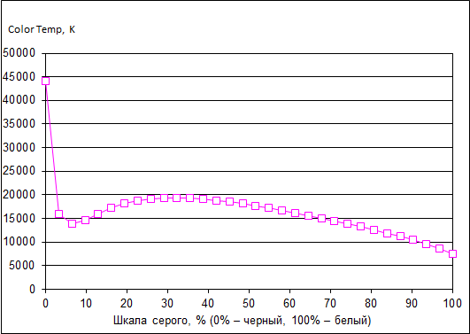Завышенная цветовая температура объясняется тем, что доля красного цвета немного занижена по всей шкале серого, а доля синего, наоборот, завышена.