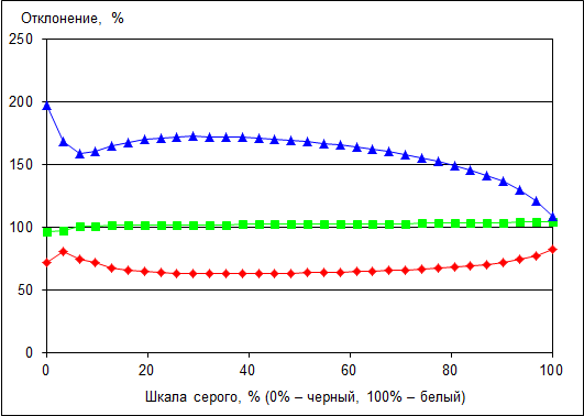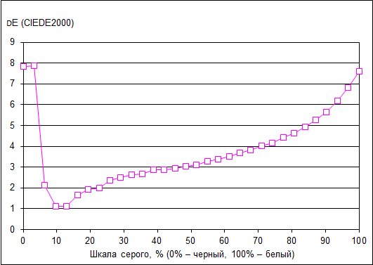 Что касается точности цветопередачи (дельта Е), то ее значение не превосходит 8, что является допустимым результатом для данного класса экранов.