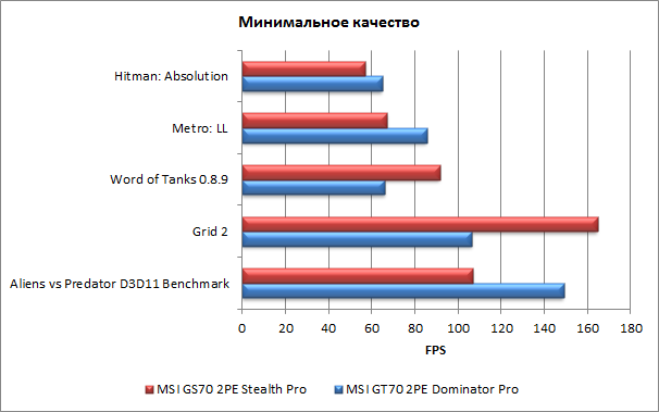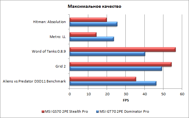 Конечно же, представляет интерес сравнение в играх результатов MSI GS70 2PE Stealth Pro (видеокарта GeForce GTX 870M) и MSI GT70 2PE Dominator Pro (видеокарта GeForce GTX 880M), поскольку это представители двух топовых игровых серий MSI. Напомним результаты MSI GT70 2PE Dominator Pro: