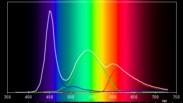 Светофильтры ЖК-матрицы немного подмешивают компоненты друг к другу. Так, в спектр красного цвета подмешивается зеленый цвет, а вот спектр синего цвета хорошо изолирован. Такая ситуация вполне типична для ЖК-матриц, используемых в ноутбуках.