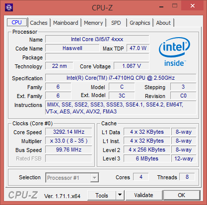 Итак, основой нашего ноутбука MSI GT72 2QE Dominator Pro является четырехъядерный процессор Intel Core i7-4710HQ. Он имеет номинальную тактовую частоту 2,5 ГГц, которая в режиме Turbo Boost может повышаться до 3,5 ГГц. Размер его кэша L3 составляет 6 МБ, а расчетная максимальная мощность — 47 Вт. В этот процессор интегрировано графическое ядро Intel HD Graphics 4600, базовая частота которого составляет 400 МГц, а частота в режиме Turbo Boost — 1,2 ГГц. Как уже отмечалось, ноутбук MSI GT72 2QE Dominator Pro может комплектоваться и другими моделями процессоров. В частности, в него могут устанавливаться процессоры Intel Core i7-4720HQ или Intel Core i7-4980HQ.