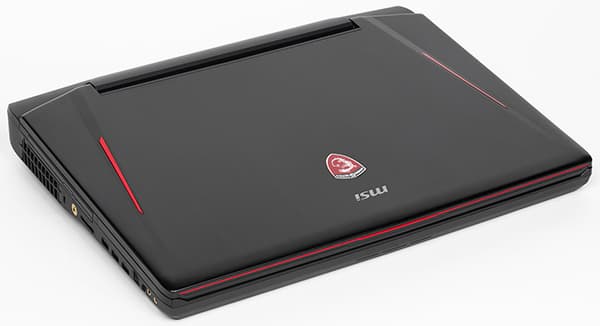 Корпус ноутбука имеет классический черный цвет, в оформлении используются декоративные бордовые вставки, что типично для игровых ноутбуков MSI.