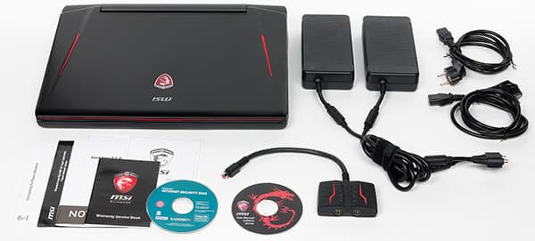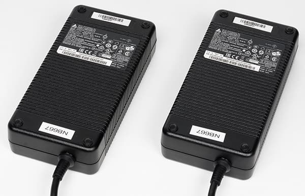 Кроме самого ноутбука в комплект поставки традиционно входит краткое руководство пользователя, DVD-диск с драйверами и утилитами, матерчатый чехол для ноутбука и, два адаптера питания мощностью по 330 Вт (19,5 В; 16,5 A). Зачем два? Не про запас, конечно же. Просто мощности одного адаптера питания для конфигурации этого ноутбука может и не хватить. Точнее, работать он будет и с одним адаптером, но не в полную мощь. Для объединения питания двух адаптеров в комплекте поставляется специальный блок-объединитель.
