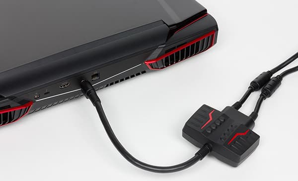 Если говорить о недостатках дизайна ноутбука MSI GT83VR 6RF Titan SLI, то, пожалуй, нужно отметить неудобную систему подключения питания. Как уже отмечалось, в комплекте с ноутбуком поставляется два адаптера питания, которые объединяются в один с использованием специального блока, а к ноутбуку подключается уже этот объединяющий блок. Кабель между объединяющим блоком и ноутбуком очень толстый, короткий и жесткий. Проблема в данном случае состоит в том, что если вы хотите передвинуть ноутбук, то нужно вначале отключить кабель питания, а потом уже двигать корпус. В противном случае, если двигать ноутбук с подключенным кабелем питания, можно очень легко сломать разъем питания в ноутбуке.