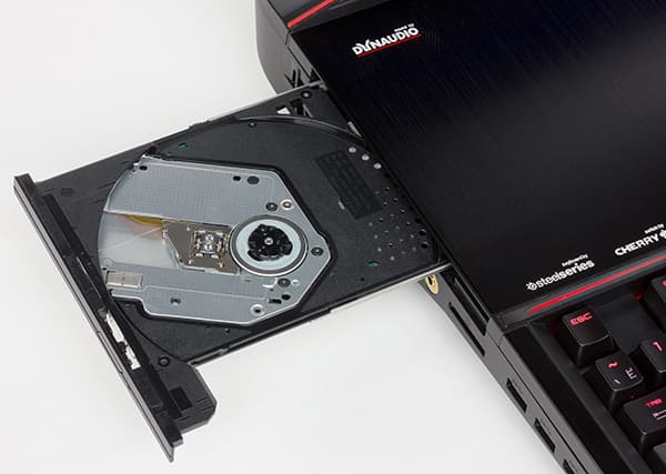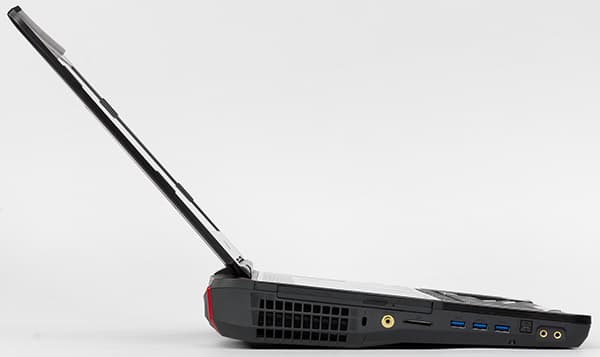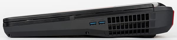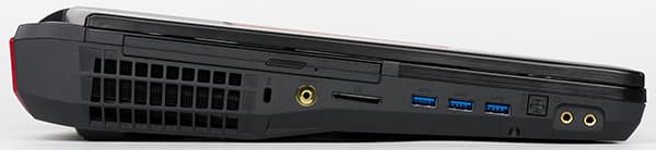 На левом торце корпуса ноутбука расположены три порта USB 3.0, слот для SD/MMC-карт памяти, три аудиоразъема типа миниджек, оптический выход S/PDIF, а также лоток оптического привода и отверстие для кенсингтонского замка. Кроме того, тут же расположена и решетка системы охлаждения для выдува горячего воздуха.