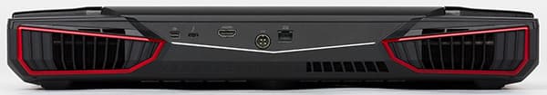 На заднем торце корпуса расположен разъем HDMI, разъем Mini-DisplayPort, разъем USB 3.1 Type-С, разъем RJ-45, а по центру — четырехконтактный разъем питания. На заднем торце тоже есть вентиляционные решетки. Отметим, что порт USB 3.1 реализован на базе контроллера Intel Thunderbolt 3.0. С учетом наличия видеовыходов HDMI, Mini-DisplayPort и USB 3.1 (Thunderbolt 3.0) к ноутбуку можно подключить три внешних монитора.