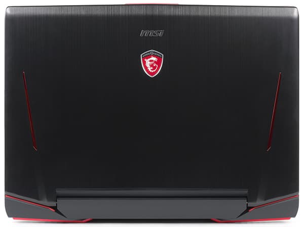 Крышка ноутбука сверху выполнена из тонкого листа алюминия, отделанного под шлифованный металл черного цвета. На крышке красуется подсвечиваемый логотип в виде щита с драконом (логотип игровой серии ноутбуков MSI) и серебристый логотип самой компании MSI.