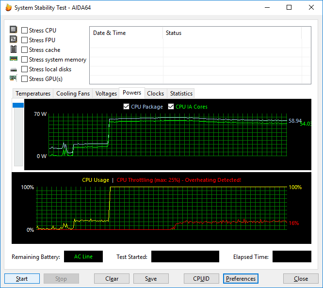 В режиме одновременной стрессовой загрузки процессора и видеокарт частота ядер процессора составляет 3,2 ГГц, а их температура увеличивается до 94 °C и может наблюдаться троттлинг. Мощность энергопотребления процессора составляет 59 Вт.